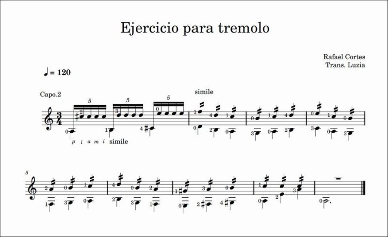 今回のラファエル先生のエクササイズはとっても簡単なのでオススメでっす。楽譜はこんな感じでっす。(サーセン!楽譜にCapo.2と書いちょりまっすが、動画はCapo.3で弾かれちょりまっす。このあたりは気分で!もちろん、Capo.無しで練習しても良か)