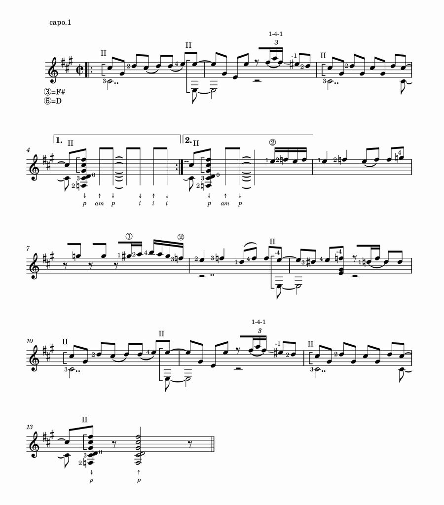 んで、このタンゴスは⑥=D、③=F#のロンデーニャ・チューニングで演奏されちょりまっす。