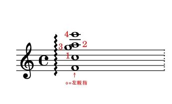 最低音のFを左親指で押さえまっす。チェロで使用される運指でっすね。
