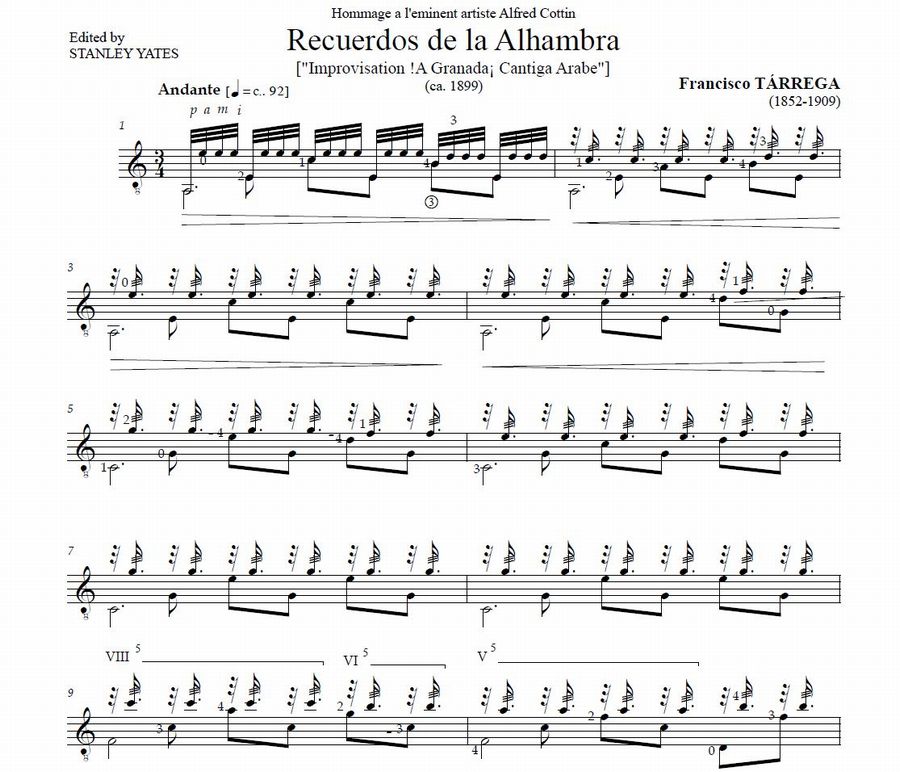 Francisco Tárrega(フランシスコ・タレガ)~Stanley Yates(スタンリー・イエーツ)運指/Recuerdos de la Alhambra(アルハンブラの思い出)(PDF)