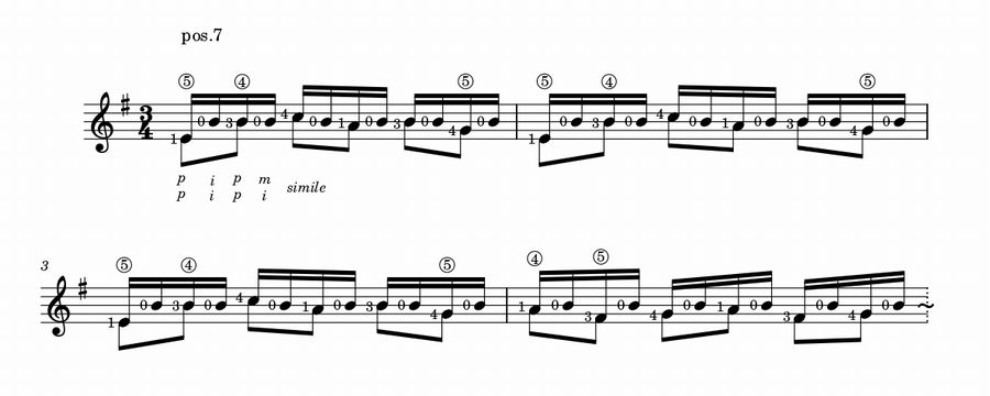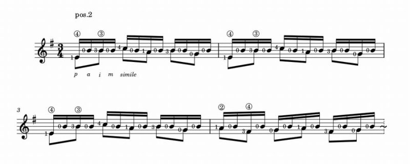 アランさんのアレンジは一般的なEm(ホ短調)に移調したものでっすが、運指が昨日ご紹介したp(右親指)- a(右薬指)- i(右人差し指)- m(右中指)で演奏されちょりまっす。
