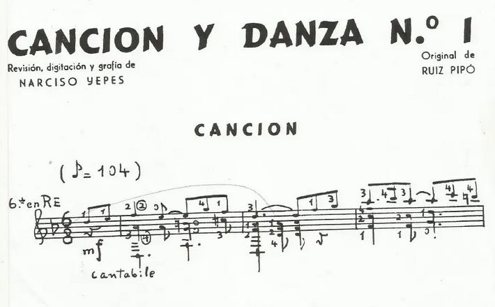 大昔にイエペスの手稿譜のまま出版されたAntonio Ruiz-Pipó(アントニオ・ルイス=ピポー)の有名な“Canción y danza No.1(歌と踊り第1番)”の譜面をご覧下され。