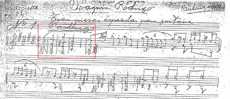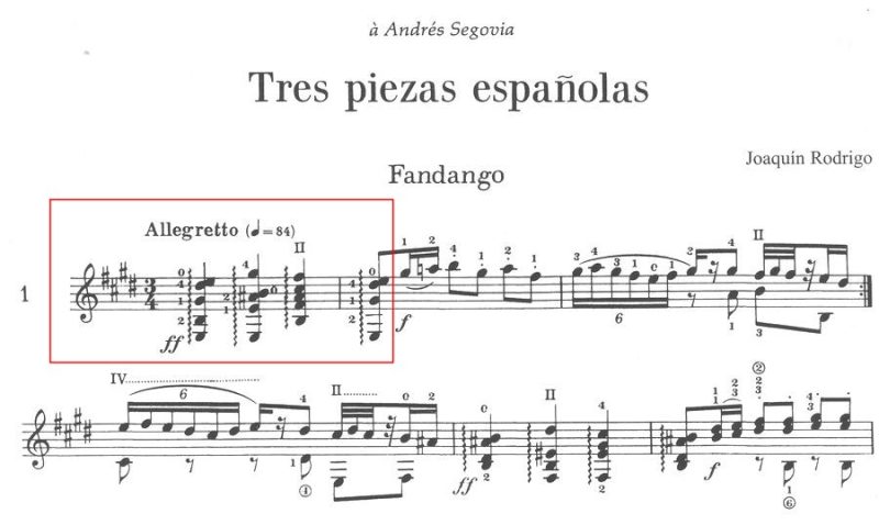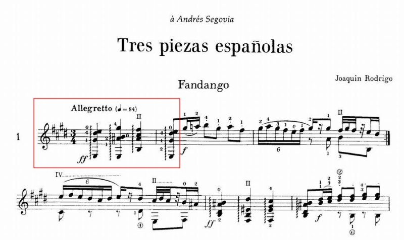 Joaquín Rodrigo(ホアキン・ロドリーゴ)の“Tres piezas españolas(3つのスペイン風小品)”の1曲目、“Fandango(ファンダンゴ)”を見てみませう。まずは1963年初版。