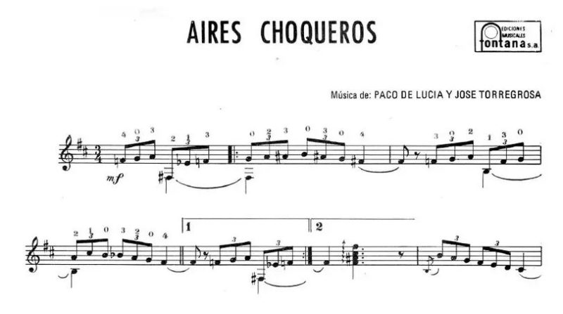 旧愚ブログでは実際の採譜楽譜を載せませんでっしたが、今回はパコの名作であるファンダンゴス・デ・ウエルバ、“Aires choqueros(邦題:いか釣り舟の唄)”の譜例を交えてご説明いたしまっす。