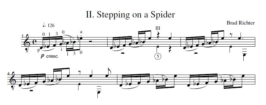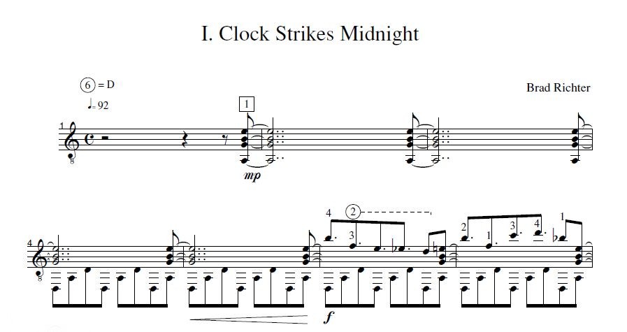 楽譜はメリケンのMel Bayから出版されているリヒターさんの作品集、“Brad Richter Solo Guitar Collection”(PDF版)に収録されているものと(上の譜例はこの曲集に収載されているものを使用したっす)、リヒターさんのウェブサイトで販売されているピース、“Three Little Nightmares(3つの小さな悪夢)”(製本版)の2種類ございまっす。