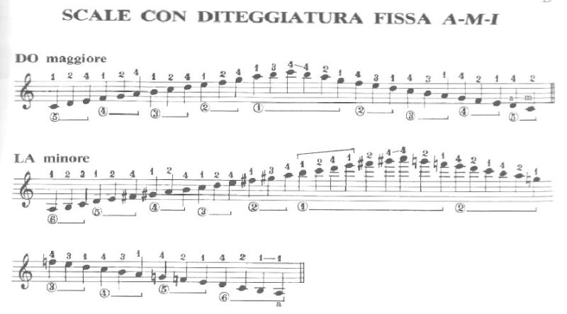 楽譜をご覧いただくと一目瞭然でっすが、ビスカルディ先生のダイアトニックスケールの運指は左右ともに必ず“3つの音”で構成されちょるのでありまっす。(楽譜にある通り、a – m – i の3本指で弾くのが基本でっす)