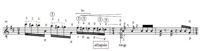 この作品では94小節3拍の6連符のパッセージで、Alzapúa(アルサプーア)のテクニックが用いられていまっする。