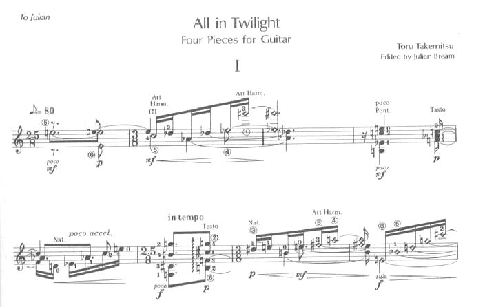 でっすので、冒頭音源のエゲレスの大巨匠、Julian Bream(ジュリアン・ブリーム)が、1987年に日本を代表する世界的な作曲家、武満 徹さんに委嘱&翌1988年に初演をした“All in Twilight−Four pieces for guitar−(すべては薄明のなかで~ギターのための4つの小品)”を聴くとたまんないっす。(音源は第1曲目のみ)