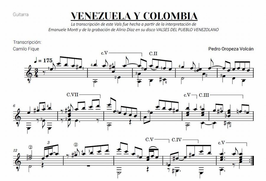 Pedro Oropeza Volcán(ペドロ・オロペサ・ボルカン)~Alirio Díaz(アリリオ・ディアス)編~Camilo Fique(カミロ・フィケ)採譜&浄書/Venezuela y Colombia(ベネズエラとコロンビア)(PDF)